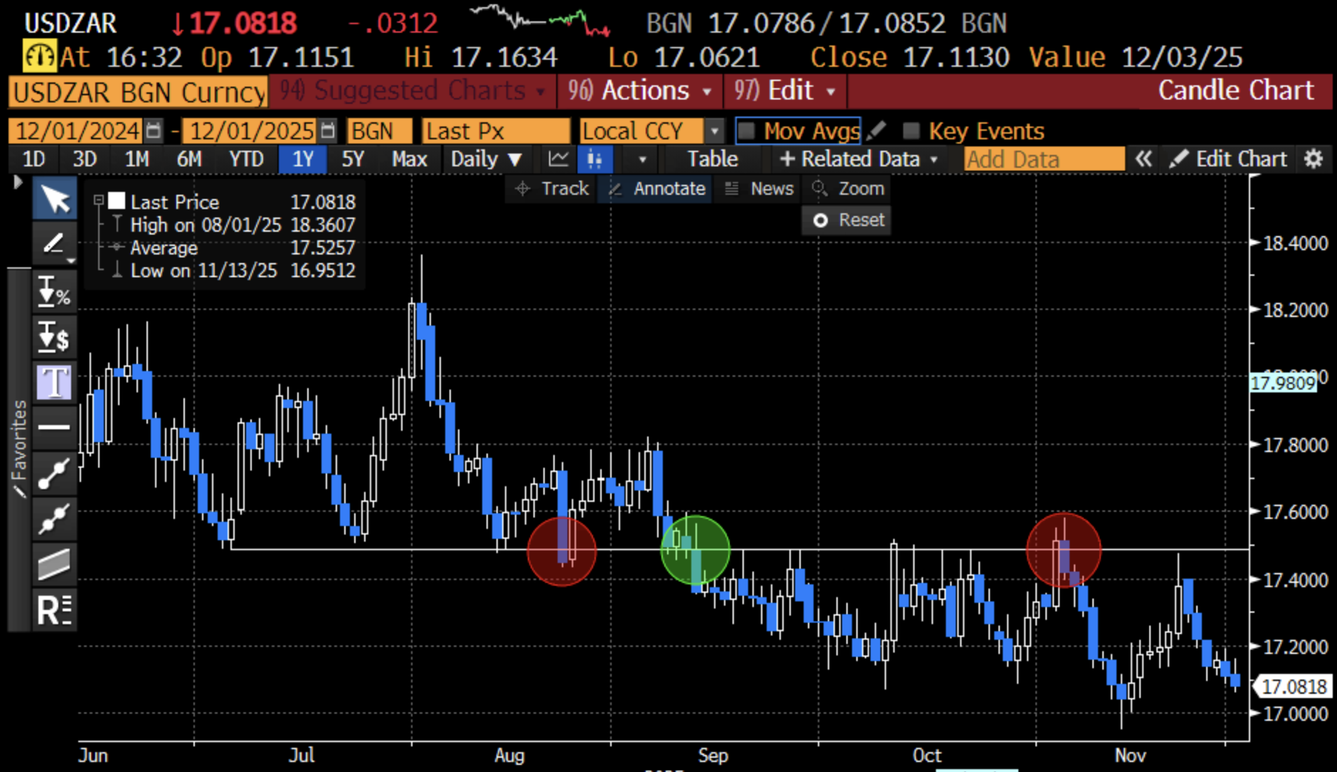 USDZAR 17.50 pivot with 2x false breaks highlighted; otherwise holding. In this example, Strategy 3 would have been problematic.